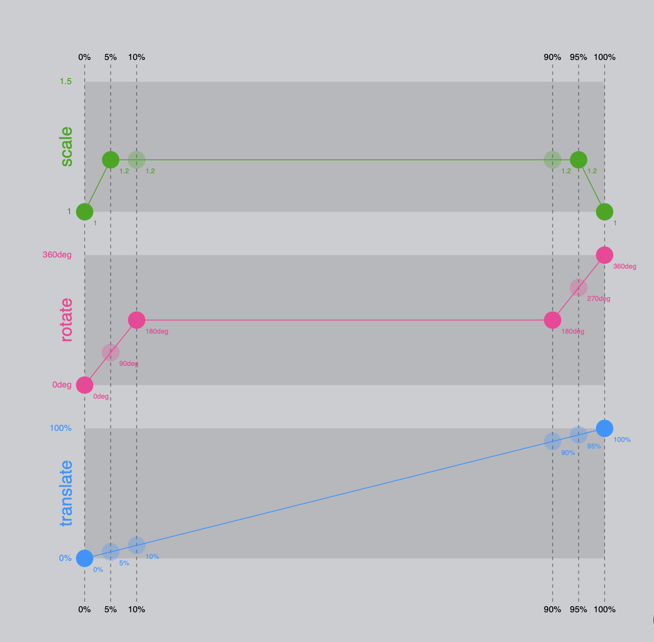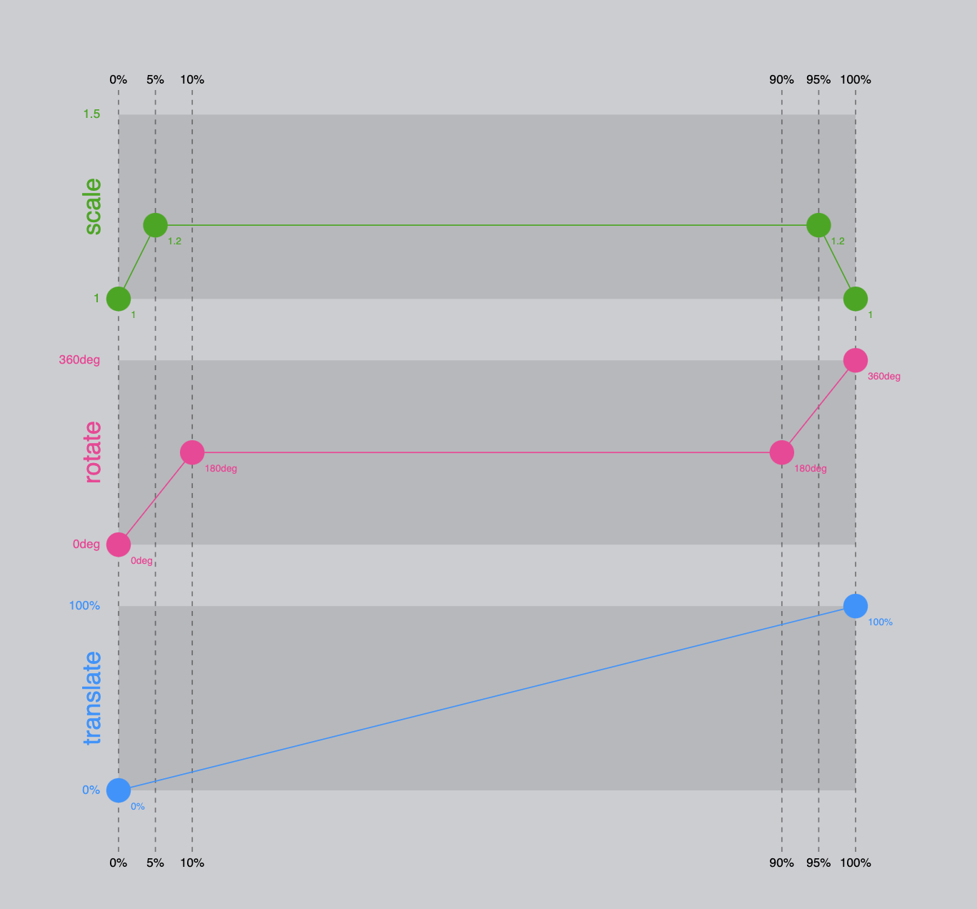 기존의 transform을 사용하여 이 애니메이션을 구현하려면 각 key frame에 정의된 모든 transform이 일어나는 순간에 대한 중간 값들이 계산되어 들어가야한다. 예를 들어, 10% 지점에서 회전 효과를 구현하려면 transform 에는 모든 속성들이 함께 기입되어야하기 때문에 다른 변환에 관련된 속성값들도 계산하고 기록해주어야한다.